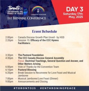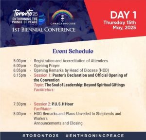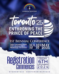 This extraordinary convention promises to be a unique opportunity for members to unite, share their insights, and contribute valuable recommendations for the advancement of both the Diocese and the Church. Mark your calendars for this transformative 3-day event, with the themed “Enthroning the Prince of Peace.” which will take place from 15th May to 18th May 2025, at the Oasis Conference Centre, located at 1036 Lakeshore Road E, Mississauga, ON L5E 1E4.