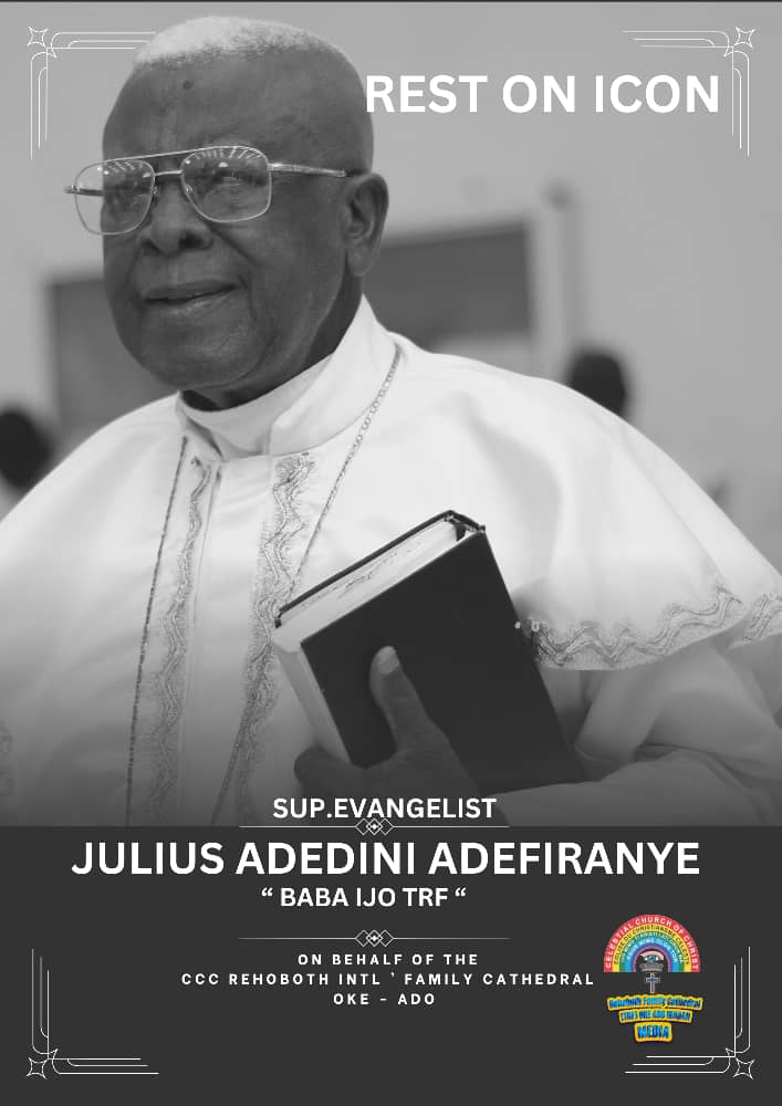 It is with heavy hearts that we announce the passing of the Patron of Celestial Church of Christ, The Rehoboth Family International Cathedral Oke Ado, Ibadan, Oyo State. The Parish is deeply saddened by the loss of Superior Evangelist Julius Adendini Adefiiranye, (BABA IJO) who dedicated his life to serving God with unwavering commitment, dedication, and loyalty to Celestial Church of Christ.