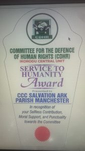 CCC SALVATION-ARK PARISH MANCHESTER HONOURED WITH AWARD OF “SERVICE TO HUMANITY” BY CDHR