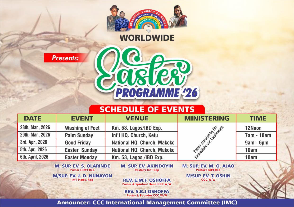 Celestial Church of Christ International Management Committee (IMC), a special body established by the Church’s Founder, Rev. Samuel Bilewu Joseph Oshoffa has officially released the timetable for the 2026 Easter activities.