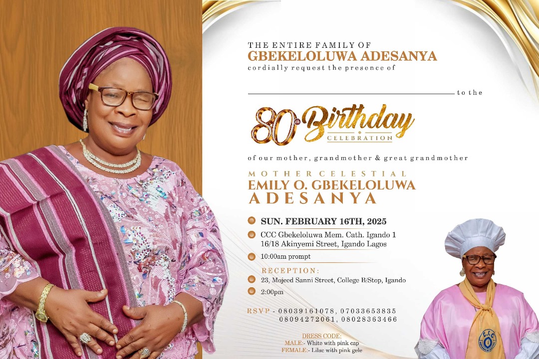As we gather on the 16th February 2025, we will come together to commemorate another significant milestone in the life of Mother Celestial Emily O. Gbekeloluwa Adesanya. On this auspicious occasion, we will offer our heartfelt prayers for her continued strength and well-being, as we will wish her many more years of good health and clarity of mind.