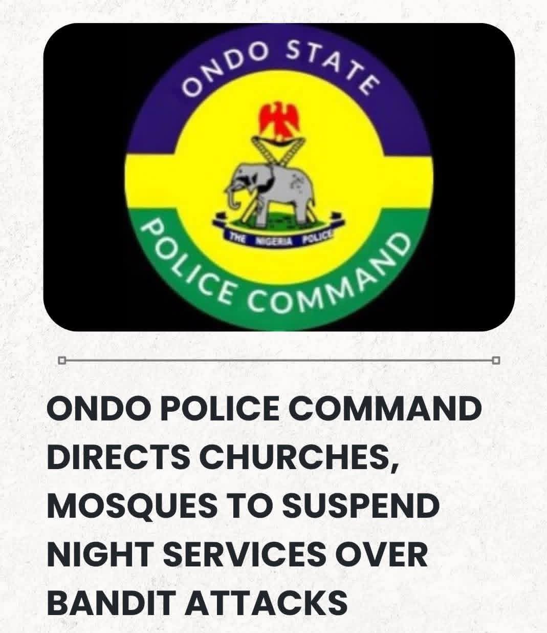 Religious organisations across Ondo State have been asked by the Nigeria Police Force to suspend vigils and night services.