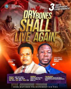 From 1st November to 3rd November 2024, Nation Transformation Ministries, Toronto, Canada will host a 3-day encounter at 2589 Eglinton Avenue West, York, ON, M6M 1T3. Prophet Israel Oladele Ogundipe will be joined by Apostle Peter Dike in an open-air revival event titled “Dry Bones Shall Live Again.”