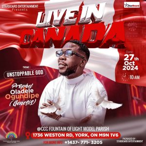 The greatest manifestation of God’s power among mankind is the power of resurrection, which has been assigned to anyone who asks for it to bring life to every dormant aspect of their lives. Prophet Israel Oladele Ogundipe, also known as Genesis Global International will be bringing the unstoppable power of God to Toronto, Canada starting from 27th October 2024.