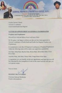 By His grace, I am happy to inform you that you have been appointed as General Coordinator of South-South and South-East Regions Prophets and Prophetesses.