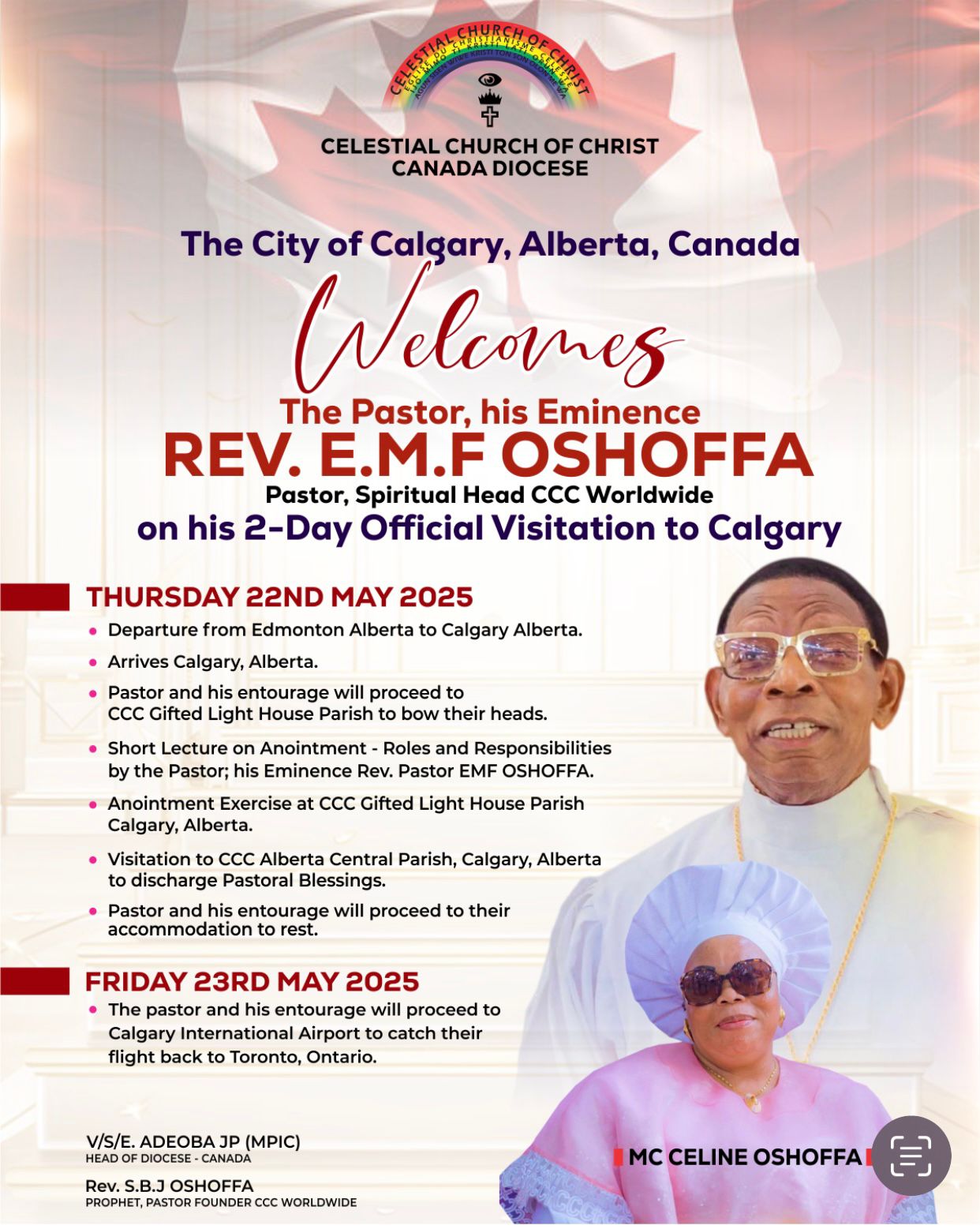 During this blessed visit, Rev EMF Oshoffa will anoint selected members at CCC Gifted Light Parish House Parish, Calgary, under the shepherdship of VSE Femi olufowose with alot of spiritual blessings and guidance that will undoubtedly deepen our faith and strengthen our unity as a individual. This celebratory and spiritual service promises to be a profound time of worship, reflection, and collective praise.